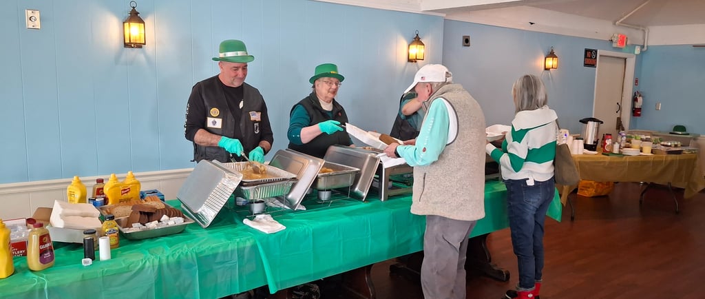 The Cohassett American Legion Riders hosted their annual Saint Patrick's Day Dinner on 8 Mar 2026. The festivities included a true Irish (-American) boiled corned beef dinner complete with cabbage, potatoes, carrots and onions. There was Irish music, beverages, and prizes. The annual dinner would not be complete without Charlie's famous Irish bread pudding. All proceeds go towards helping the local and extended veteran community such as the Gary Sinise Foundation and Tunnels to Towers. The Cohasset Riders would like to thank everyone who made this annual event a success and shared the day with us. The riders will finish out St Patrick's day by participating in the Scituate St Patrick's Day parade.